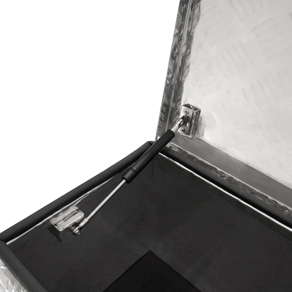 Security is paramount with our aluminium tool box. It is fully lockable and comes with two keys, providing maximum protection for your valuable tools and accessories. For effortless access, the tool box features a hinged lid equipped with two gas struts, ensuring smooth and easy opening. Inside, a rubber base lining keeps your items securely in place during transit, preventing any movement or damage.
