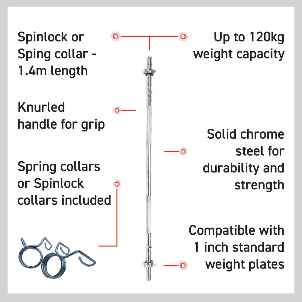 - WEIGHTLIFTING BARBELL BAR - Made of durable, heavy-duty solid chrome steel with a weight capacity of 120KG. This 1.4m barbell bar is available with spring collars or spinlock collars.