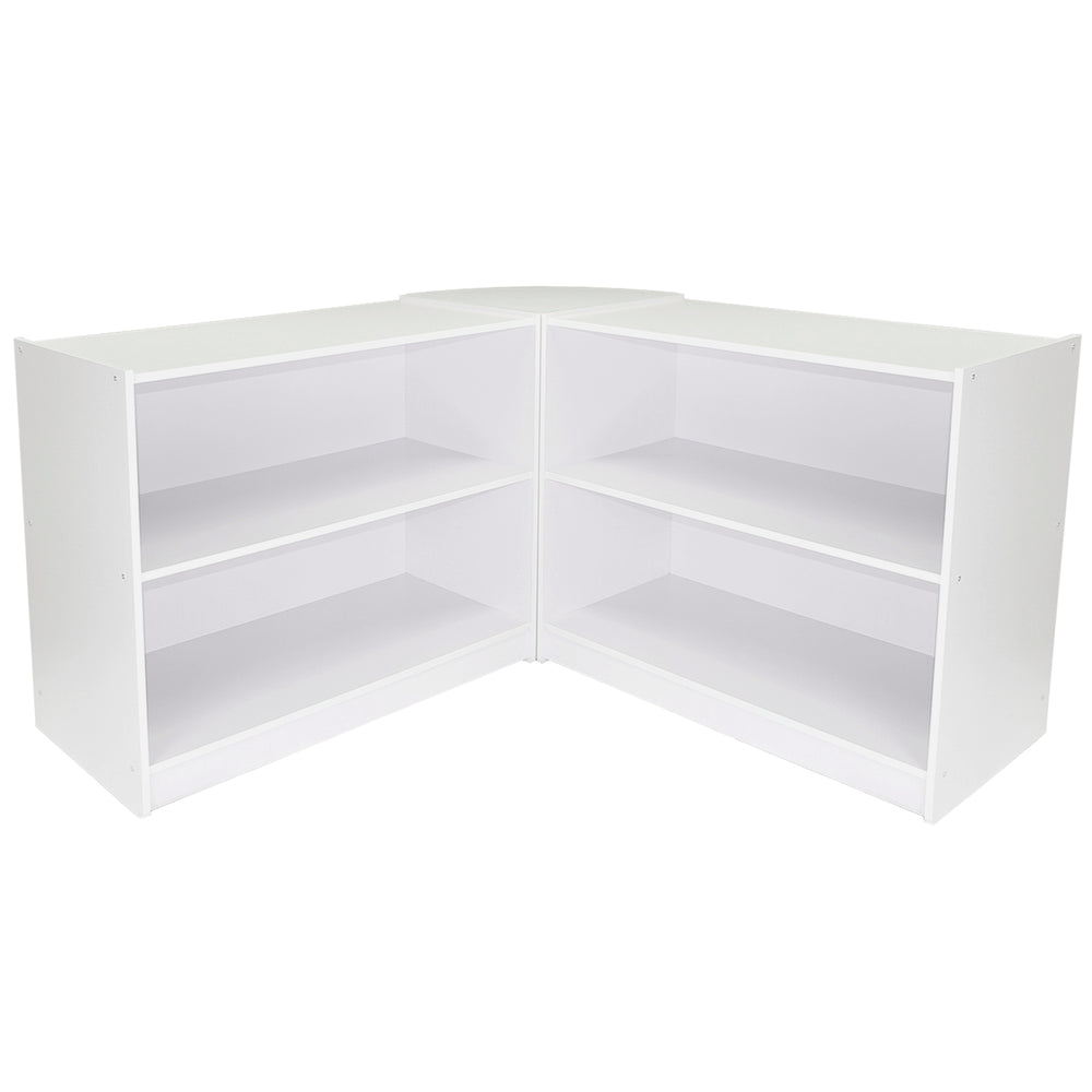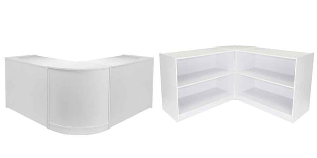 These popular front of house and shop counter display units provide contemporary and strong retail displays to showcase a wide variety of items and products. Each of the units can be used individually or as part the set; they are designed to fit together to create a stylish counter unit which will provide the perfect platform to display products in any retail setting. Within this Zodiac bundle you will receive: Two A1200 white shop counters, which are the solid retail unit with a closed front and substantial under counter storage to the rear with 1 fixed internal shelf. These versatile units are ideal to be used as a serving area but can also be displayed with the shelves customer facing for POS display purposes. Dimensions: 90cm high x 120cm wide x 60cm deep (each) The closed CM60 counter is a curved retail display unit with storage shelves to the rear. The unit is designed to connect the A1200 counters together to create a large L shaped counter set but can also be used as a standalone unit. Dimensions: 90cm high x 60cm wide x 60cm deep. Please note: Counters will arrive flat packed and two people are required for lifting and assembly.