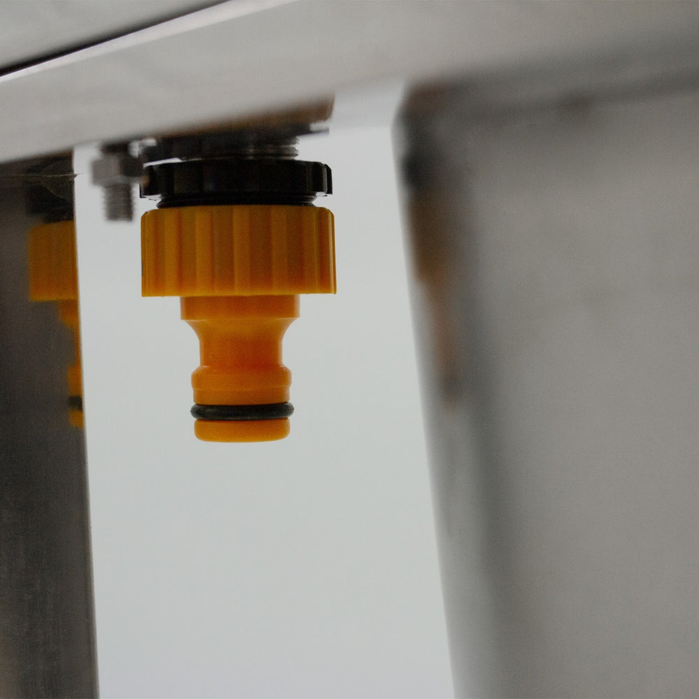 The outdoor sink can easily be connected to a water source with a simple hose fitting.