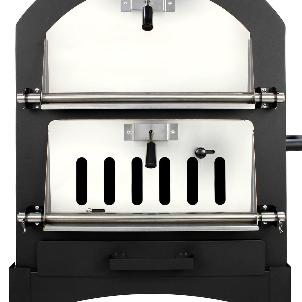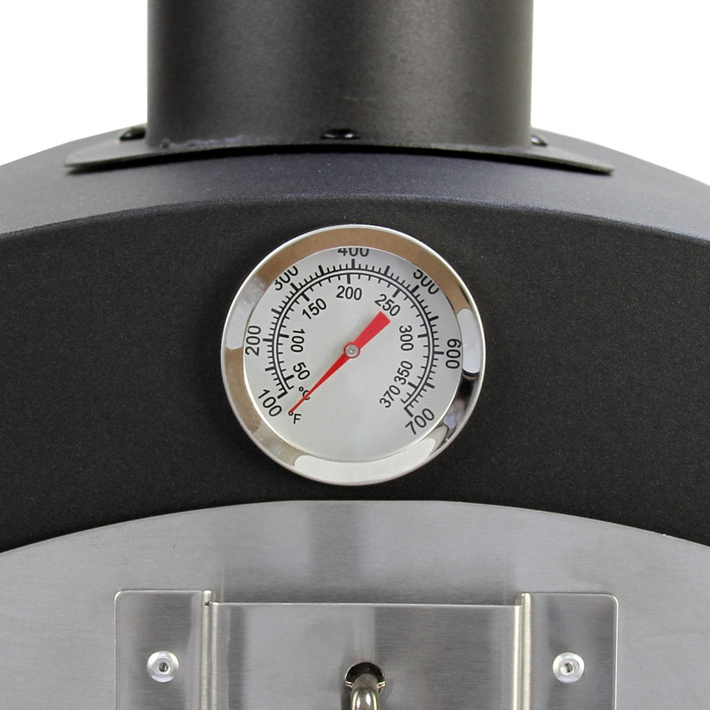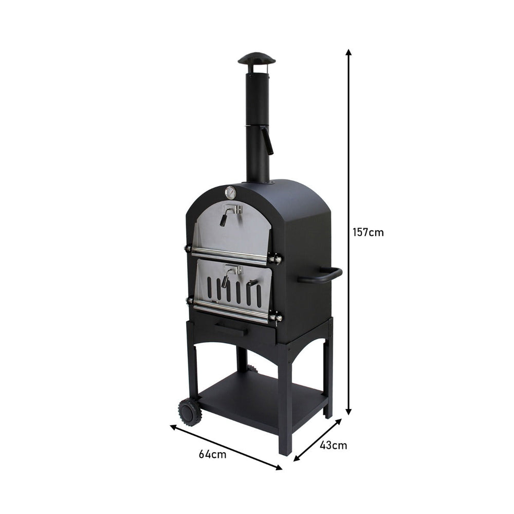 This impressive outdoor pizza oven is designed to deliver the ultimate pizza-making experience. Crafted from high-quality stainless steel and coated with a black powder finish, this sleek and sturdy oven is built to withstand the test of time. Fuelled by charcoal, it allows you to create mouth-watering pizzas with that signature smoky flavour. Its spacious cooking chamber can accommodate pizzas up to 12 inches in diameter and cooks them in record speed, perfect for satisfying hungry guests with your traditional-style pizza. Take full control of your cooking with the built-in thermometer and adjustable airflow controls, ensuring precise temperature management for perfectly cooked pizzas every time. With its compact size, lower storage shelf, and portable design, it's the ultimate addition to your outdoor entertaining setup.