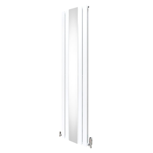 Infuse warmth into your home with our cutting-edge flat panel vertical radiator in white with a sleek central mirror and thermostatic chrome valve set - a perfect blend of timeless elegance and modern efficiency.