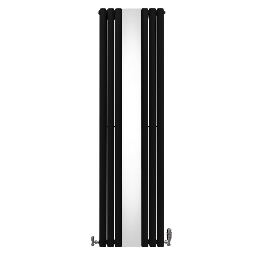 Infuse warmth into your home with our cutting-edge oval panel vertical radiator in black with a sleek central mirror and thermostatic chrome valve set - a perfect blend of timeless elegance and modern efficiency.