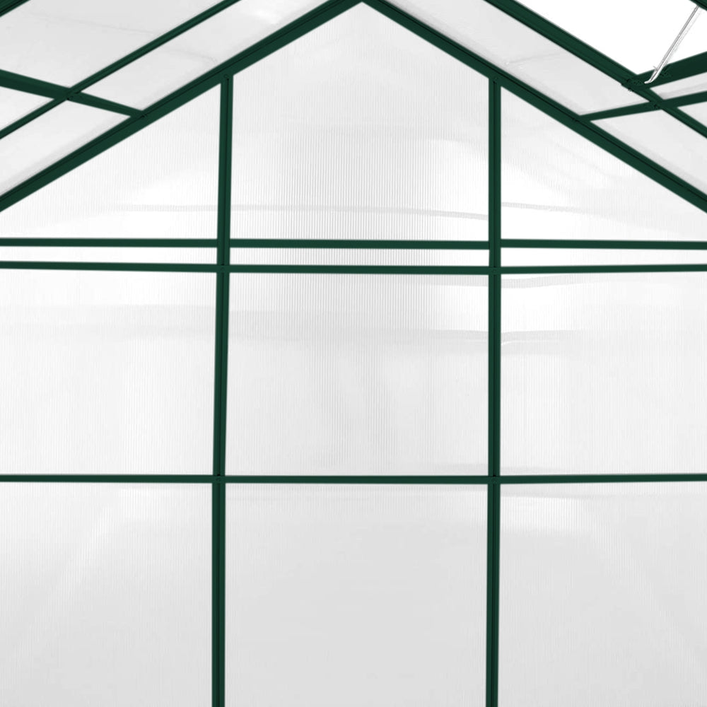 This glorious greenhouse is constructed with a thick aluminum frame and high-density polycarbonate sheets. The shatterproof twin wall pc sheets help protect your plants from UV rays, whilst letting you admire their beauty from the outside.