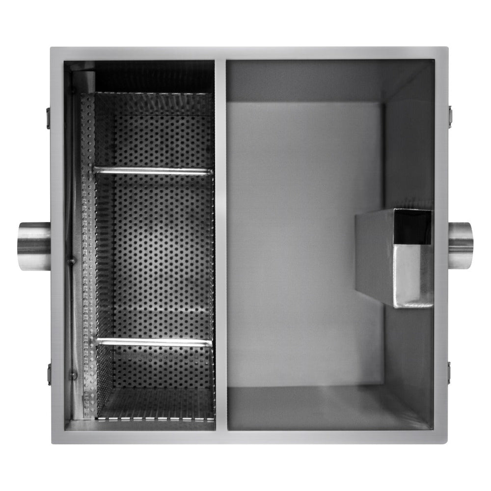The intelligently designed interior incorporates a large basket which captures the food waste upon entry into the trap. Numerous small holes enable water to flow through the basket while the oil content rises to the surface. To ensure maximum grease separation the tank is partitioned by a baffle, creating two distinct sections. With a 2cm clearance below the baffle, water can effortlessly transfer over, segregating it from the oil and directing it to the 50mm outlet on the right-hand side for disposal.
