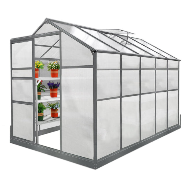 This glorious green house is constructed with a thick aluminum frame and high-density polycarbonate sheets. The shatterproof twin wall pc sheets help protect your plants from UV rays, whilst letting you admire their beauty from the outside.