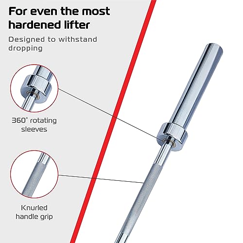 - OLYMPIC BARBELL BAR - Made of durable, heavy-duty solid chrome steel with a weight capacity of 250KG. This Olympic barbell lifting bar has rotating sleeves with brass bushings which allow for a smooth 360° spin during training