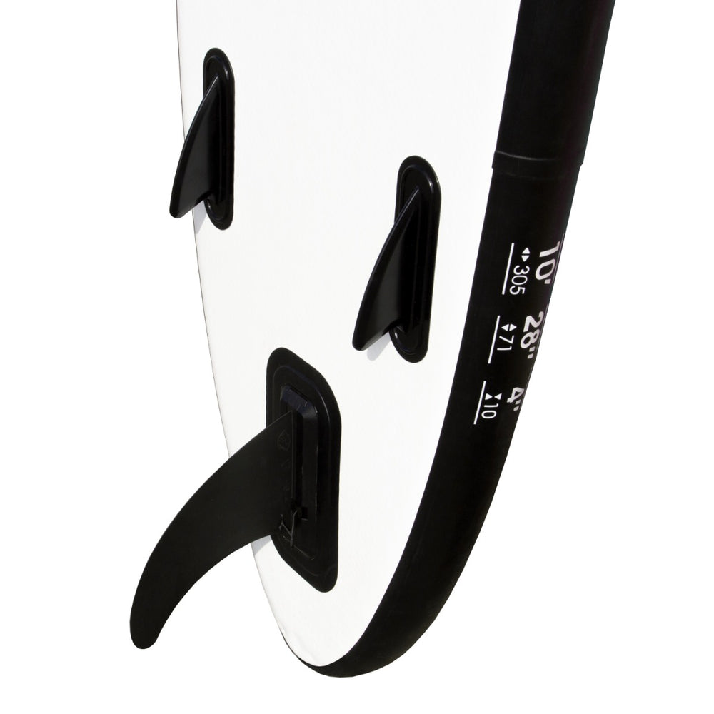 Constructed with a double drop-stitch material, it is far lighter than a solid board – weighing a mere 6.75kg – while still delivering a comparable level of rigidity that can withstand up to an enormous 100kg. As well as being super lightweight, a central handle allows you to easily carry the inflated paddle board into and out of the water. A non-stick traction deck contributes toward a solid foundation with a superior grip for comfort and steadiness on the water. Three modelled fins provide directional stability to effortlessly navigate your way through the water as well as added speed by cutting through the waves. The 9” tail fin is also removable making the SUP easier to pack away and protected during transit.