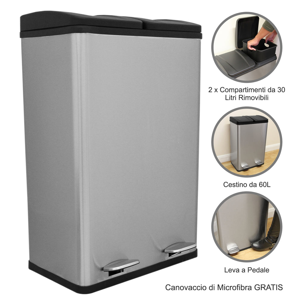 - A durable, dual compartment pedal bin with an impressive overall capacity of 60L