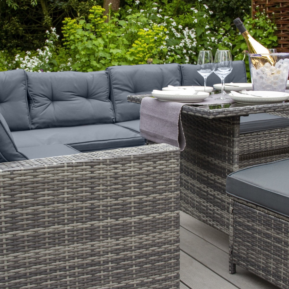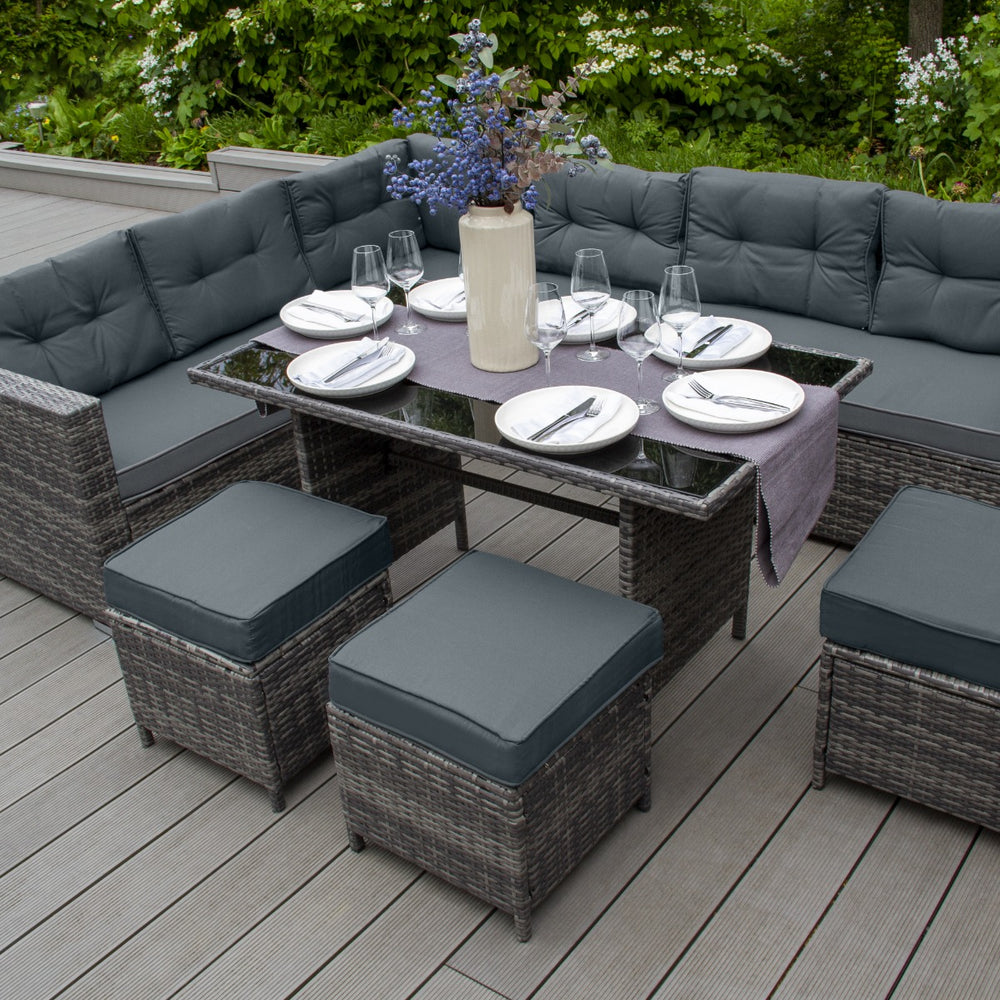 Designed for maximum style and comfort, this exquisite dining set is made up of a corner sofa, 3 x stools and a glass top table. Able to comfortably seat nine people, this set is sure to be the perfect centrepiece for any garden party or dining al fresco.