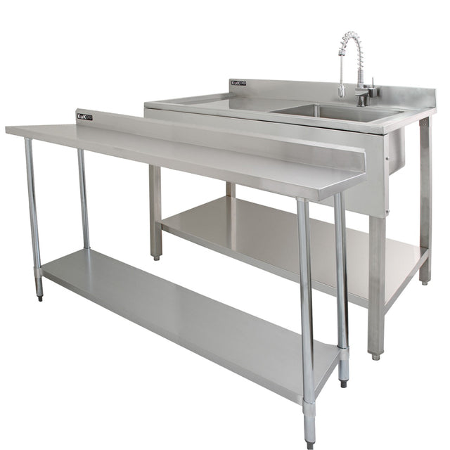 If you’re in need of more space to prepare your delicious food, then look no further than this KuKoo catering table measuring approximately 5ft wide. With 250kg weight capacity across two shelves, this bench is an excellent storage option and allows you to have everything to hand as you bring your creations to life. Each of the edges are completely flat so tables can sit flush side by side or up against appliances like the fridge. The 100mm upstand will also sit flat against the kitchen wall, protecting it from any splashes. The adjustable features mean you can really make each commercial table perfectly suit your kitchen. Simply twist and correct the feet individually to keep it steady on uneven floors. Keeping things organised and tidy is easy with the lower shelf storage which can be moved up or down the table legs depending on what you're storing.