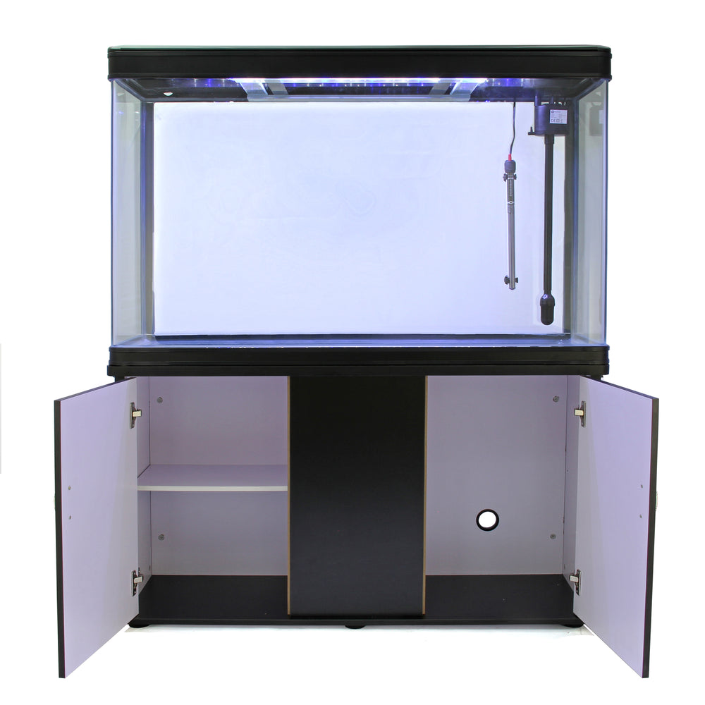 Coming with a stylish matching matt black cabinet underneath, with plenty of room to store your supplies within the two-door space, the aquarium itself features a lovely black trim and an incredible curved glass exterior. The 11mm thick glass gives you perfect transparency and a 180° view of your beloved fishy friends. Stability is also provided with fitted feet at the bottom of the cabinet, making it perfect for all types of flooring.