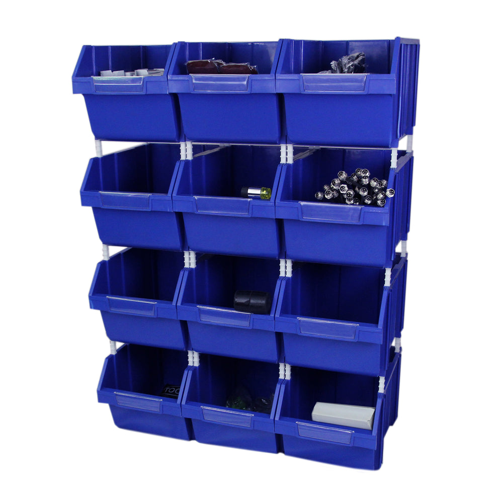 - 12 blue storage bins with a maximum load capacity of 50kg each.