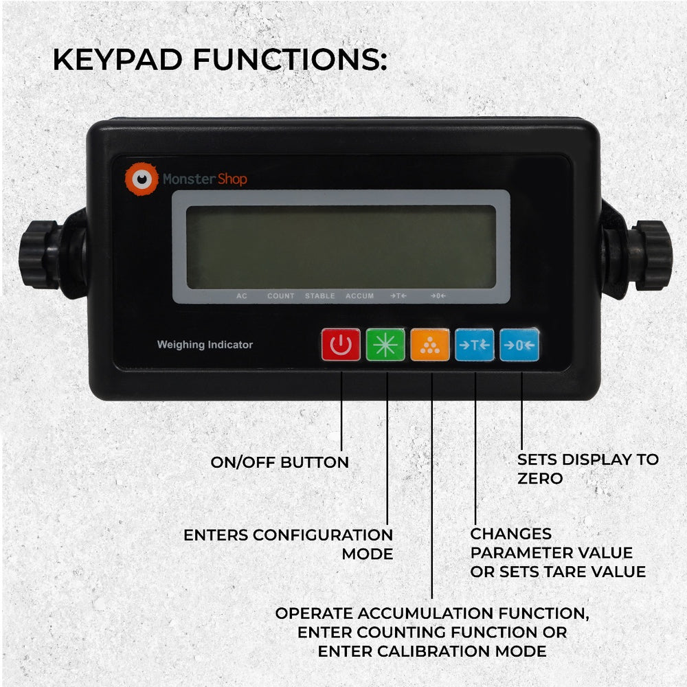 - Functions: Zero / Tare, Weighing, Count, Accumulate